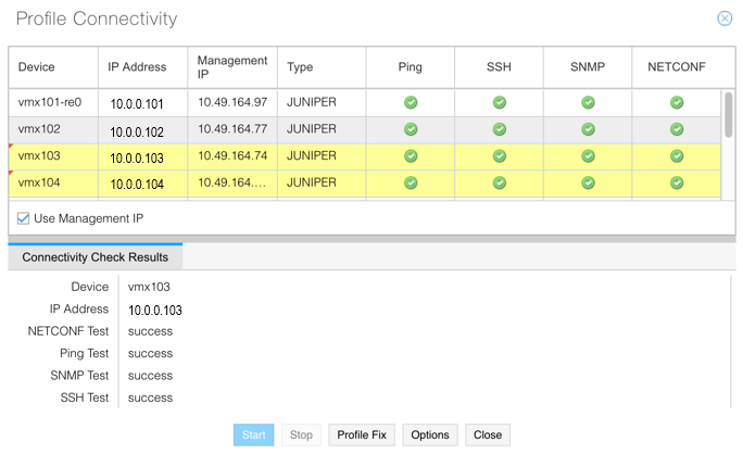 Select one or more devices in the device list and click Test Connectivity. In the Profile Connectivity window, click Start. The test is complete when the green (pass) or red (fail) status icons are displayed. Figure 8 shows an example.