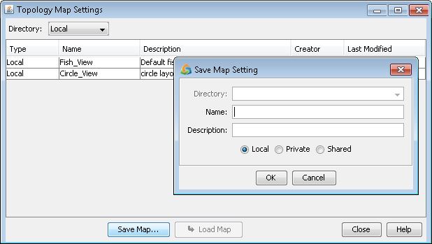 Click Save Map and enter a Name and optional Description to save a new map view. Local is for offline networks. Private and Shared are for Live networks.