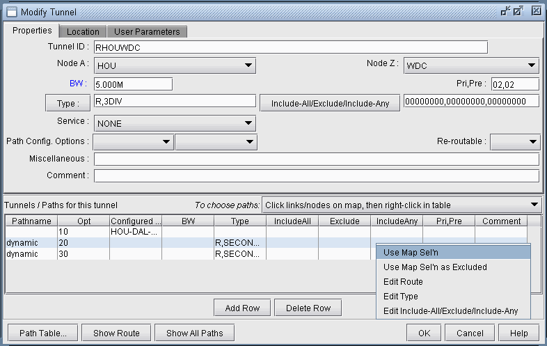 For Cisco, the two alternate routes can be given different priorities using the “Opt” field (the defaults are multiples of 10). For Juniper, specify for the two backup routes if they are secondary or standby in the Type column by entering in R,STANDBY for a standby tunnel or R,SECONDARY for a secondary tunnel. Right-click an entry and select Edit Type for more options.