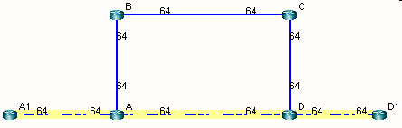 Figure 5: Results of Using an IP Address Not Matching the Route Map CriteriaNetwork topology diagram with nodes A, B, C, and D in a rectangle connected by blue lines and nodes A1, A, D, and D1 in a line connected by yellow dashed lines. Links labeled with bandwidth 64.