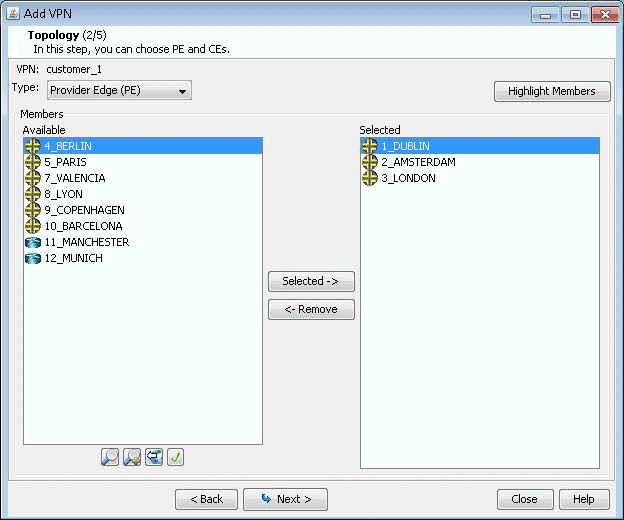 Figure 2: Select PEs and Specify a VCIDStep 2 of 5 in VPN wizard; Topology configuration. VPN Name: customer_1; Type: Provider Edge. Selected locations: Dublin, Amsterdam, London.