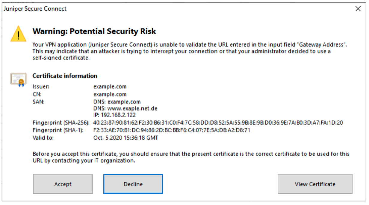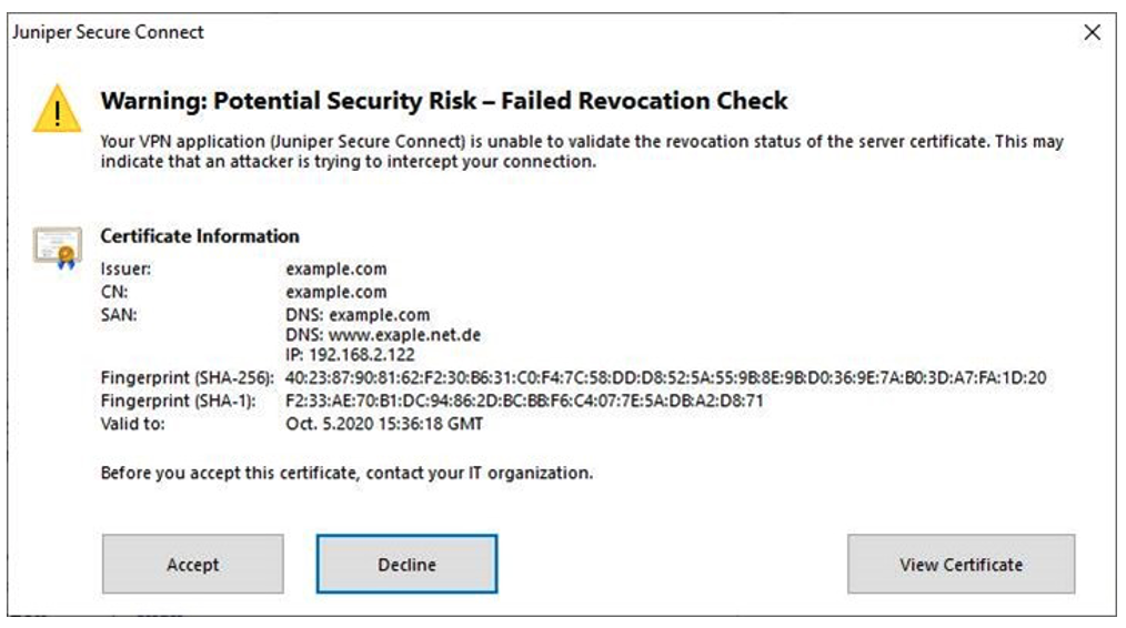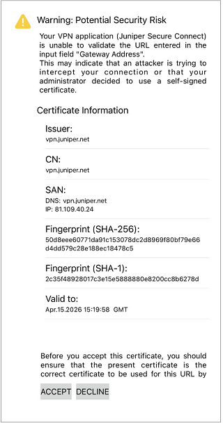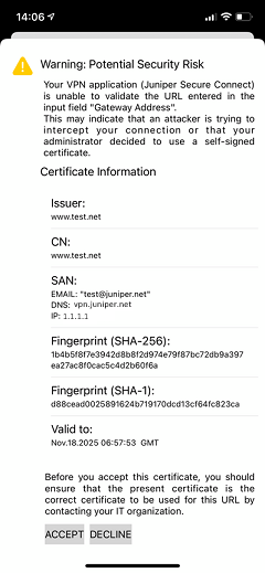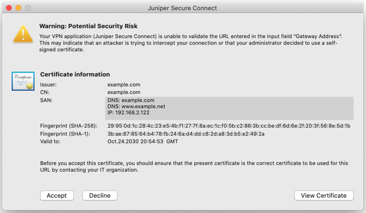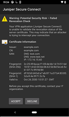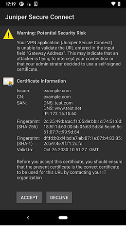 To know more about a valid gateway certificate, we recommend that you understand different warning messages you see on the Juniper Secure Connect application.
