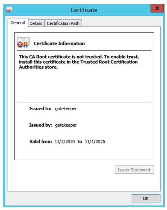 As a system administrator, you must inform your users what action they need to take when a warning message is displayed. The easiest way to validate your certificate as an administrator is to click on the warning message in the browser toolbar to display the certificate details as shown in Figure 2 and Figure 3 or load the correct root certificate on the client.