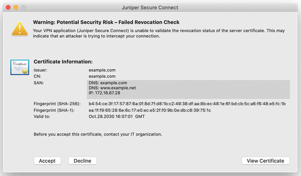 If the gateway uses a certificate where the root certificate has not been distributed to the application (Create Installation Packages for Juniper Secure Connect Rollout on Windows and Create Rollout Packages for Juniper Secure Connect Installation on macOS), you will be prompted with a warning message shown in Figure 6, Figure 7, Figure 8, and Figure 9 based on the platform where the Juniper Secure Connect application is installed.