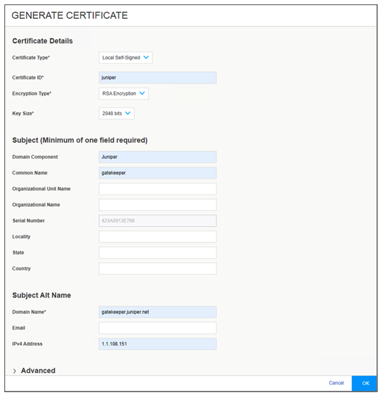 Figure 1 shows the minimum of values that you should configure. Ensure that these values matches with your own organization. If you initiate a Certificate Signing Request (CSR), the certificate must be signed by your CA before it is loaded on the SRX Series Firewall.