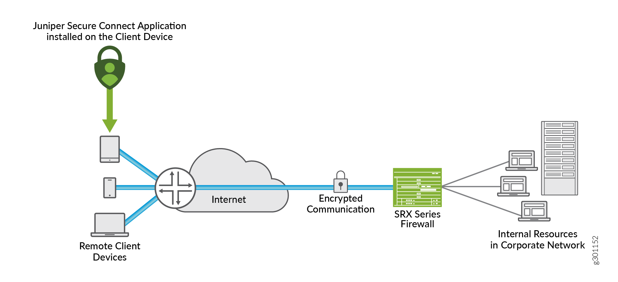 Figure 1 illustrates the Juniper Secure Connect remote access solution for establishing secure VPN connectivity for remote users at different locations. The solution allows your device to connect securely to the corporate network through encrypted tunnels over the internet.