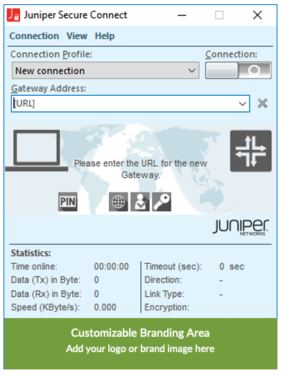 Juniper Secure Connect for windows allows you to add your own logo or branding image. It also allows you to add HTML page for the branding image that would open when you click on the branding area in the Juniper Secure Connect. The HTML page is optional where you can provide any information you want. You should customise the installation package for branding your client. For detailed instructions, see Create Installation Packages for Juniper Secure Connect Rollout (Windows).