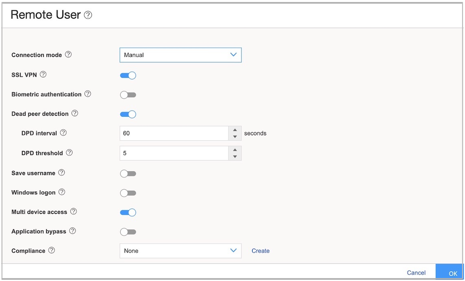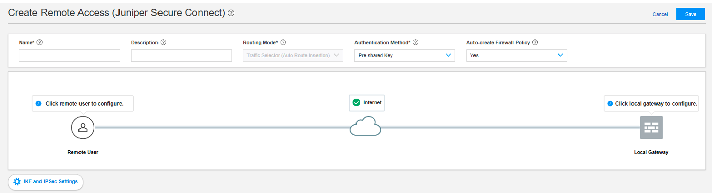 At the right corner of the page, select Create VPN > Remote Access > Juniper Secure Connect to create the IPsec VPN setting for Juniper Secure Connect.