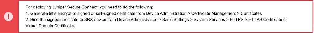 You must ensure that the SRX Series Firewall uses either a signed certificate or a self-signed certificate instead of the default system-generated certificate. Before you start configuring Juniper Secure Connect, it is important that you read the instructions in Get Started with Juniper Secure Connect.