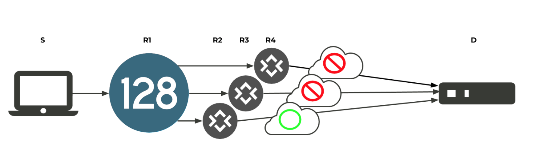 Without a peering SSR, or without the use of dynamic routing protocols, the SSR considers all next hops equally, even though some paths may not provide a path to the destination. The following diagram depicts a case where two of the three paths to the Conductor are not available, even though the next hop gateway is responsive.
