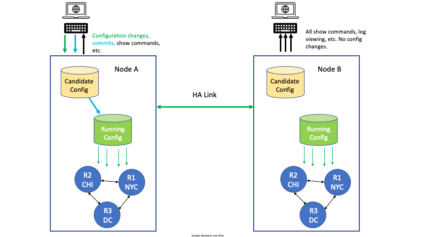 To avoid this situation, designate one node as the edit node. For example, in an HA configuration with two nodes, DataCenter Node A and DataCenter Node B, designate DataCenter Node A as the edit node. All configuration changes are made on Node A. All other commands can be run on Node B, but no configuration changes or commits, whether from the GUI, PCLI, or an API, are made from Node B.
