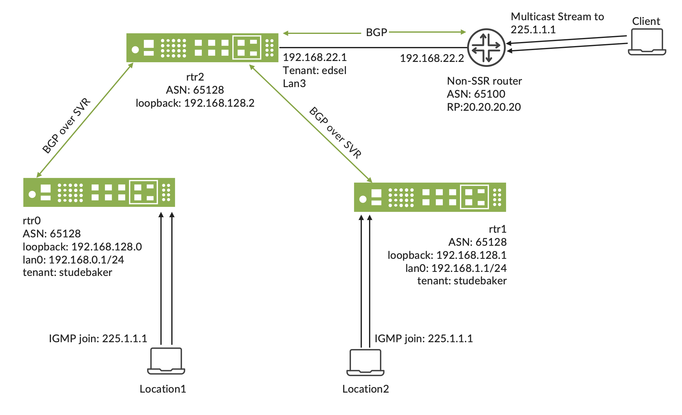 The following diagram represents a simple multicast configuration. A Client sends a multicast to address 225.1.1.1. Location1 and Location2 want to receive this multicast stream. The network is setup to use an external, non-SSR Rendezvous Point (RP) at 20.20.20.20 for all multicast traffic. This router is 192.168.22.2 and is configured for BGP with SSR rtr2. It advertises 20.20.20.20 as the RP for multicast into BGP, allowing the SSR network to identify the path to the RP.
