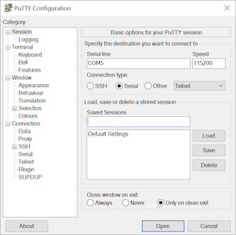 - From the Windows Device Manager, open a PuTTY session, and select the serial port and baud rate.