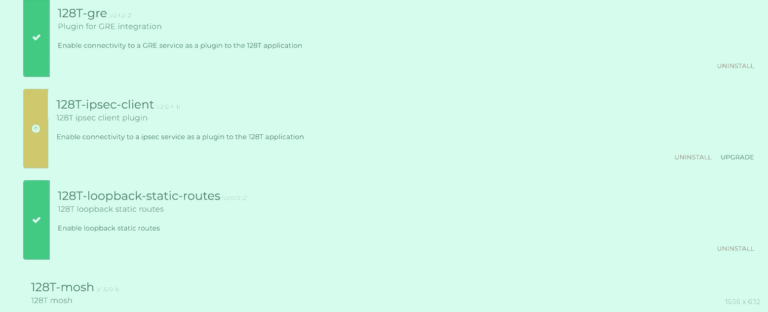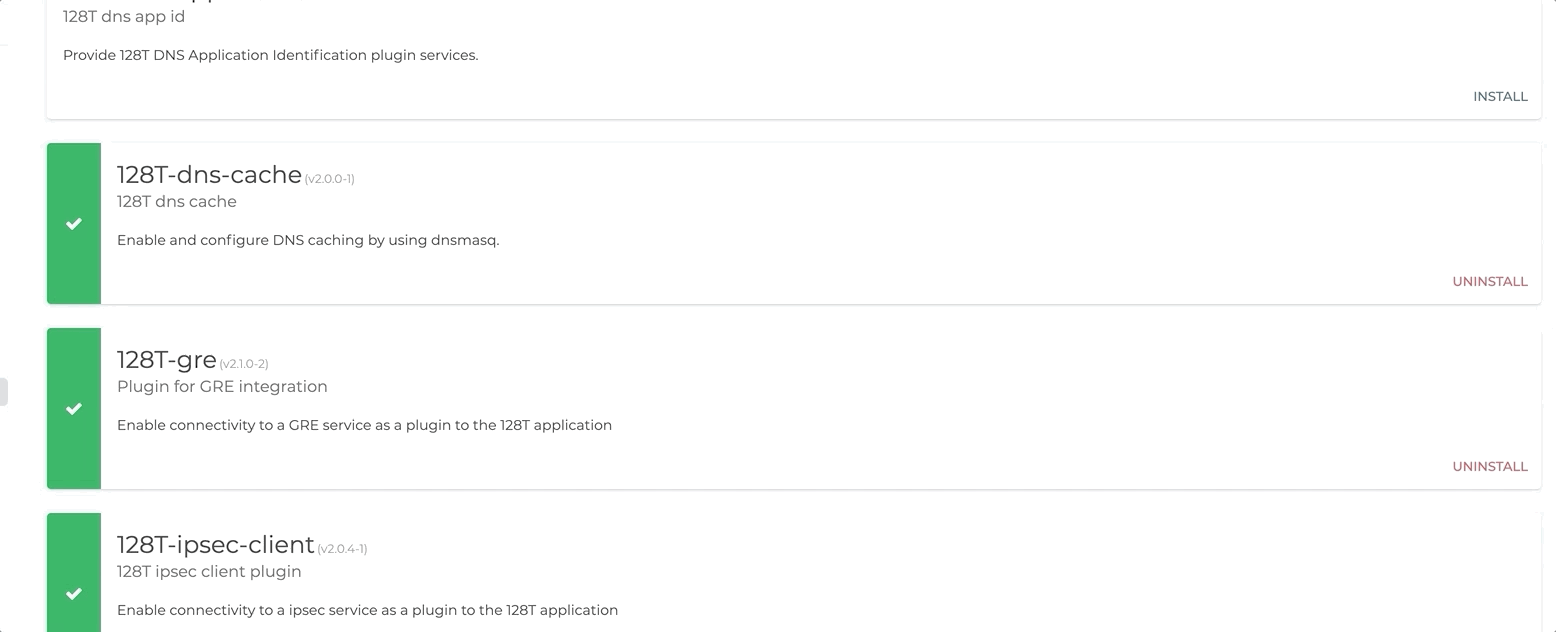 The dashboard above shows the available and installed plugins. The 128T-dns-cache plugin in the dashboard above is available and ready to be installed on the conductor. The 128T-gre plugin shows a green icon meaning it has been installed and ready to be configured. The 128T-ipsec-client plugin has an orange icon indicating that a new version of the plugin is available for installation, though the currently installed version is still actively being used by the conductor.