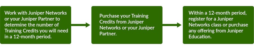 Step 1: Order Juniper Networks Training Credits from a Juniper Networks account manager, JNAEP, or Juniper partner.