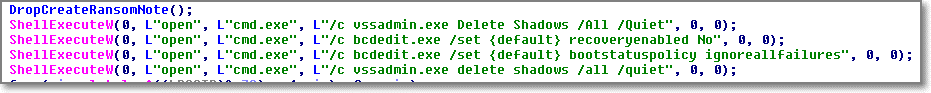 It deletes volume shadows to prevent file recovery by running the following commands using ShellExecute API.