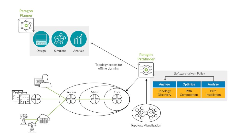 Network operators that provide cloud hosted content, applications, and services must deliver assured experiences to their end users. Exceptional experience is an essential requirement in today’s digital world. Network automation simplifies operations for the operator while improving the customer experience, eliminating the impact of human error, and reducing the cost of customer churn. To help operators reach these objectives, Juniper offers Paragon Pathfinder and Paragon Planner—cloud-native WAN automation products that are part of the Juniper Paragon Automation portfolio. These solutions allow operators to efficiently manage their services through automated planning, proactive monitoring, and optimization.